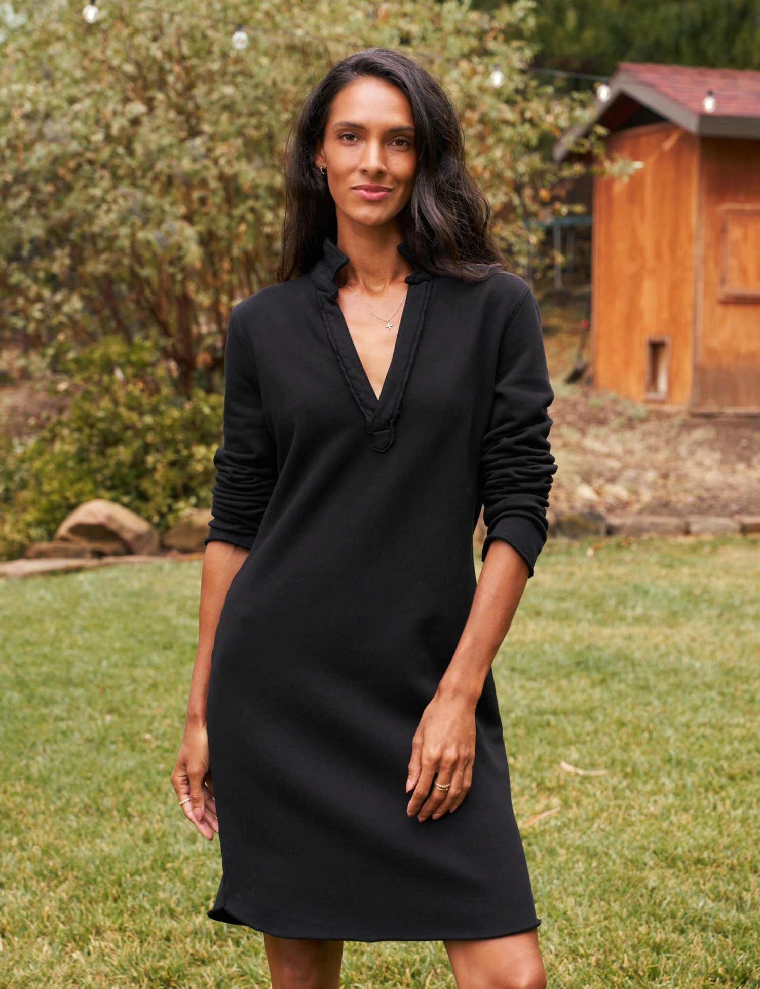 Meet our preppy Popover Henley in dress form! With a slight drop sleeve, sporty v-neck, and straight raw-cut hem that hits just above the knee, this piece will take you from the tennis court to lunch…and back again.